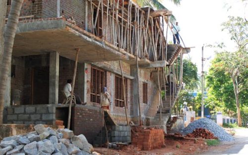 Construction zone. Construction workers live in little cinder block huts next to the house they are building.