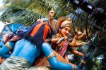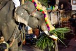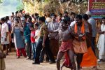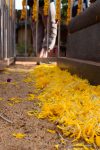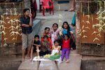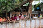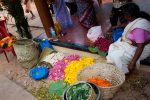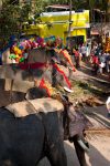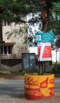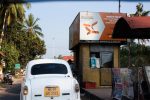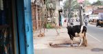 Interesting corner. note the cows next to the rickshaw hut and the school bus